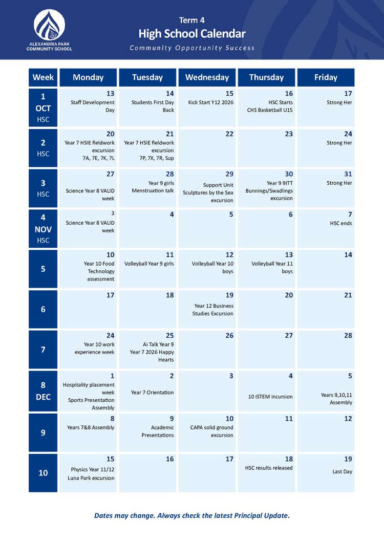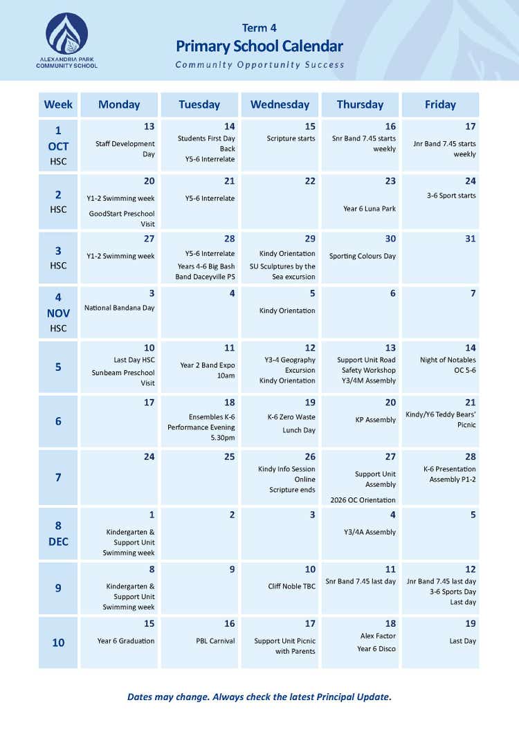 Please be aware the following dates may change. Always check the latest Principal Update for the current calendar.